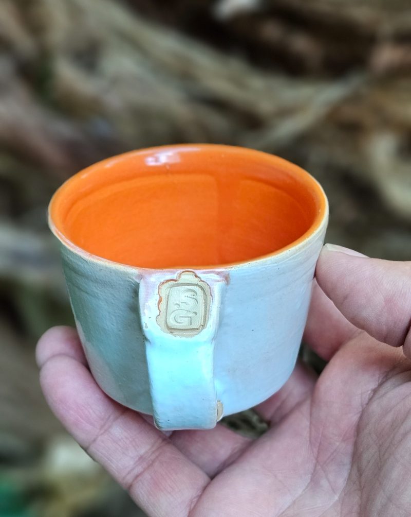 Color: Opaque White and Organge Sorbet and Iron Oxide at the bottom of the cup.